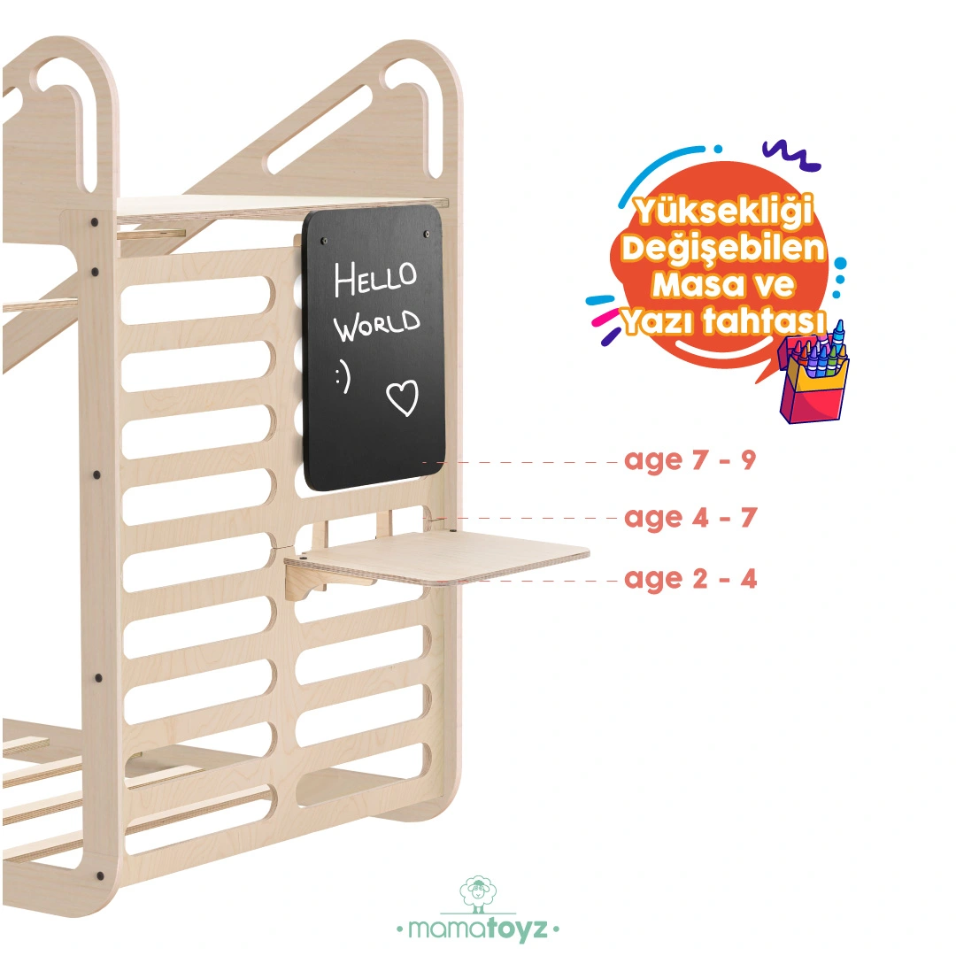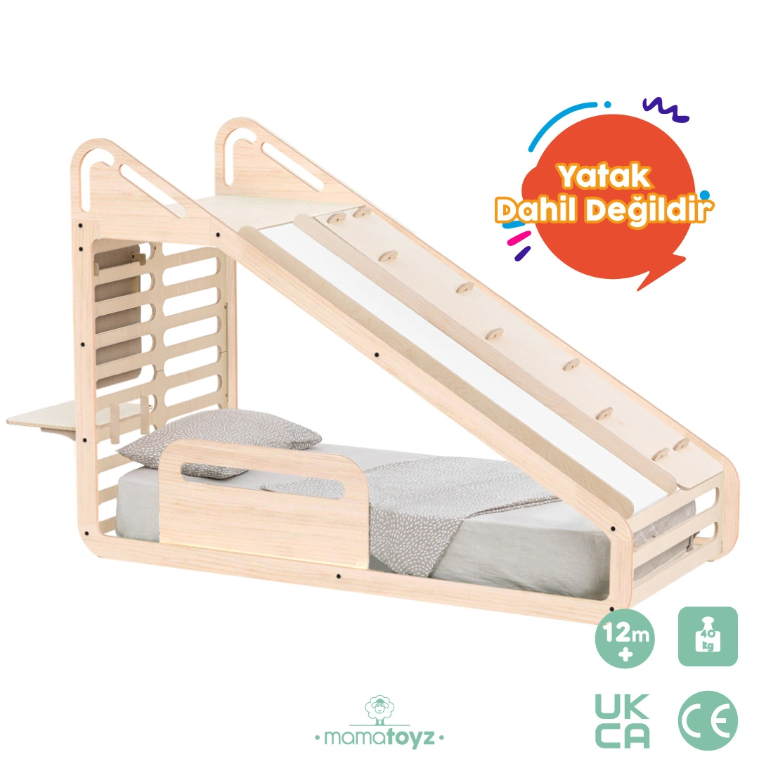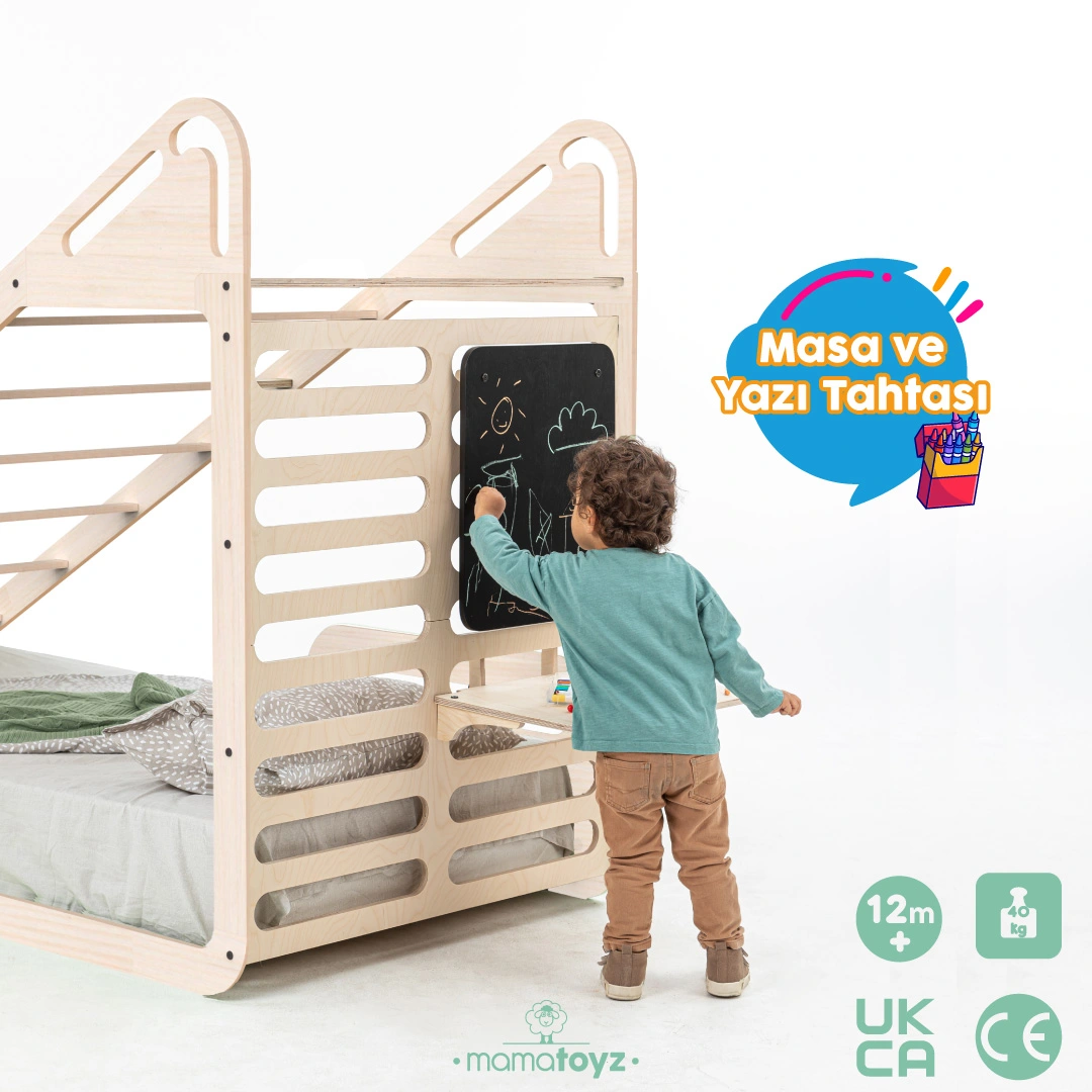Sleepy Montessori Karyola ve aksesuarları ile çocuklarınızın odasında hem güvenli bir uyku alanı hem de eğlenceli bir oyun ortamı yaratın. Ahşap yapısı, salıncak, yazı tahtası ve masa gibi detaylarla gelişimi destekler.
