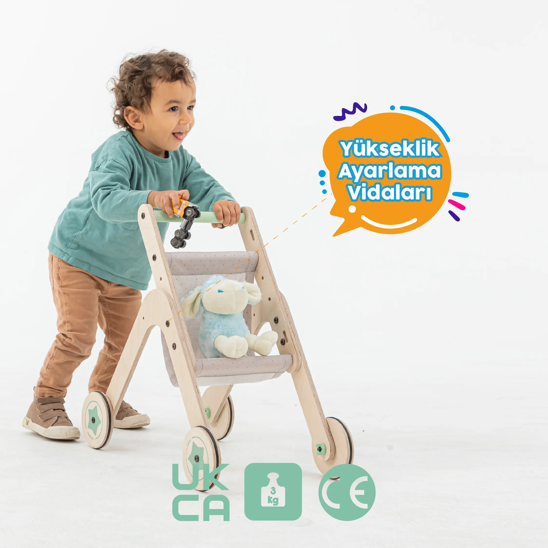 Trio Stroller, hem yürüteç hem de oyuncak arabası olarak iki işlevi ile çocuğunuzun gelişim sürecine katkı sağlar. Ev içi aktivitelerde sıkılmadan zaman geçirmesini sağlarken, ebeveynlere de güven verir.